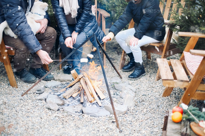 Друзья в теплой одежде жарят зефир на палочках и болтают, сидя у костра