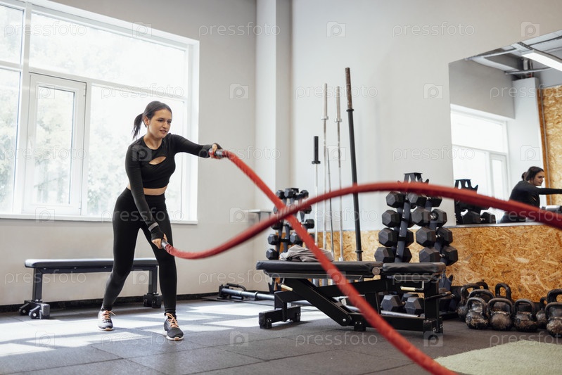 Привлекательная молодая стройная и подтянутая спортсменка, работающая в тренажерном зале для функциональных тренировок, выполняющая упражнения по кроссфиту с боевыми канатами