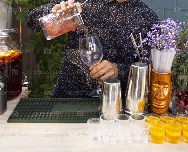 Стаканы коктейлей в баре. Бармен наливает бокал игристого вина с красным алкоголем