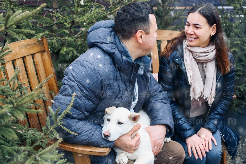 Прекрасная молодая пара с милой собакой сидит на заднем дворе снаружи в окружении молодых хвойных деревьев