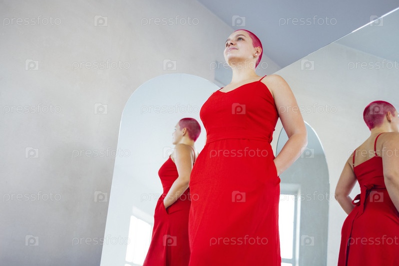 Красивая расслабленная женщина в красном длинном платье и рыжих волосах смотрит в зеркало