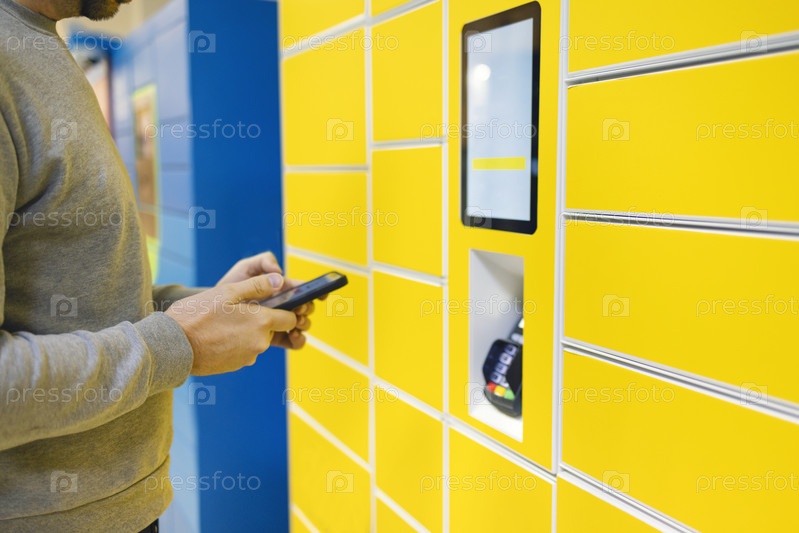 Крупным планом мужчина забирает почту из автоматического почтового терминала самообслуживания