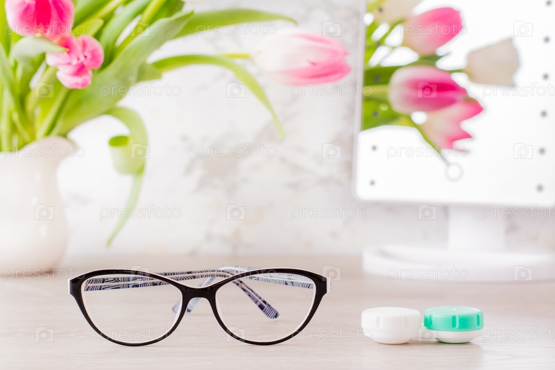 Слабое зрение и выбор между очками и линзами. Контейнер для линз и очков перед зеркалом на столе и букет тюльпанов в вазе