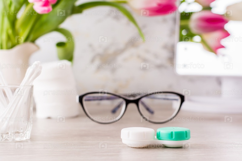 Слабое зрение и выбор между очками и линзами. Контейнер для линз на фоне очков, средства гигиены и зеркало на столе