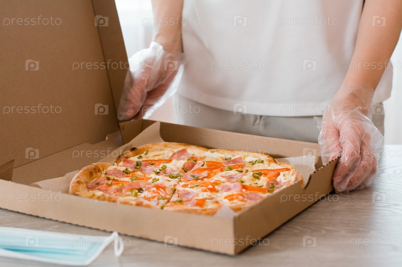 Еда на вынос. Женщина в одноразовых перчатках держит картонную коробку пиццы и защитную маску на столе на кухне