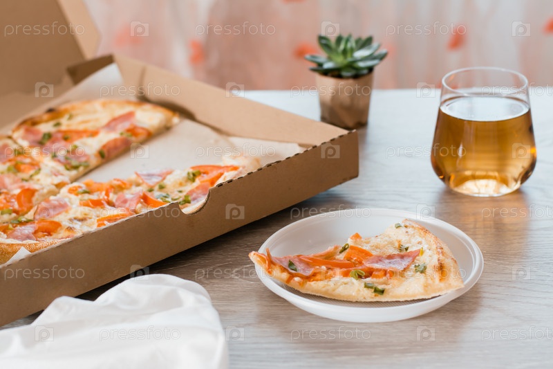 Еда на вынос. Кусок пиццы в одноразовой пластиковой тарелке, пиво и коробка пиццы на столе на кухне
