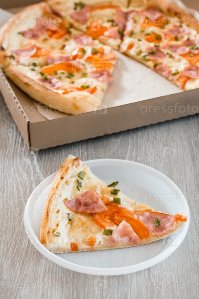 Еда на вынос. Кусок пиццы в одноразовой пластиковой тарелке и коробка пиццы на столе на кухне. Вертикальный вид