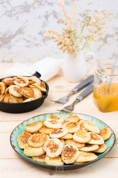 Трендовый завтрак. Голландские мини-блины на тарелке и сковорода с ними на деревянном столе. Крупный план. Вертикальный