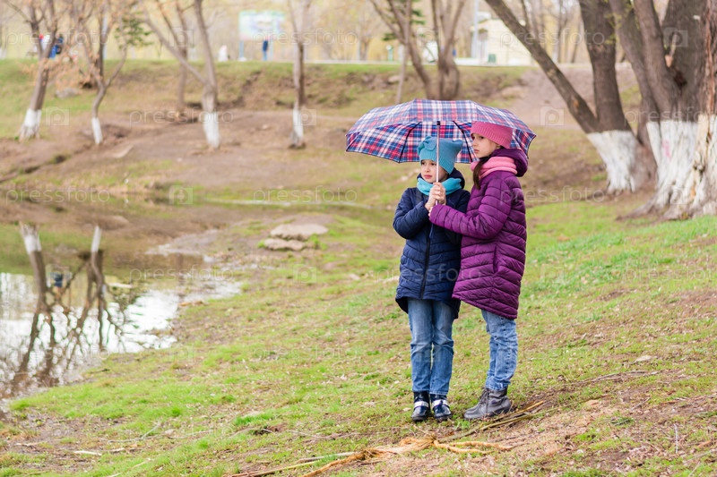 Две девушки-сестры стоят под зонтиком на берегу озера ранней весной. Прогулка на свежем воздухе