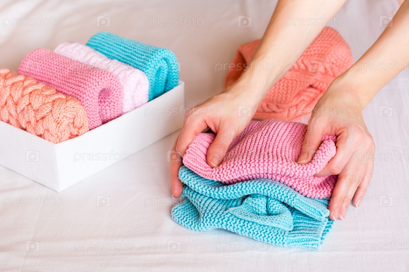 Организация и порядок. Женские руки складывают вязаную одежду рядом с коробкой с аккуратно сложенными вещами