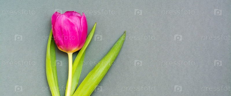 Одинокий розовый тюльпан с зелеными листьями на сплошном темном фоне. Скопируйте пространство. Веб-баннер
