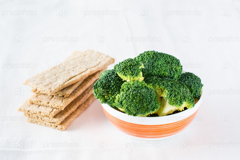 Свежая брокколи в миске и зерновой хрустящий хлеб на столе на скатерти