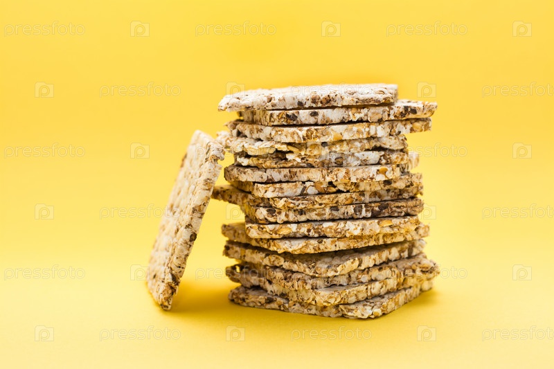 Здоровое питание. Хлебцы из овса, пшеницы, льна и кунжута в стопке на желтом фоне. Суперфуд