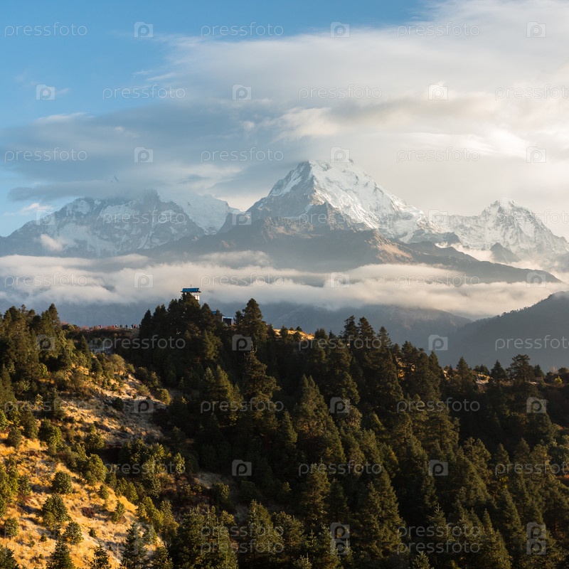 Вид на горный хребет Аннапурны с холма Пун на восходе солнца. Это знаменитая смотровая площадка в деревне Горепани в заповеднике Аннапурна, Непал