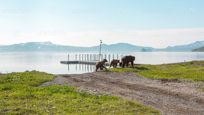 Бурый медведь с двумя детенышами у Курильского озера, Камчатка, Россия