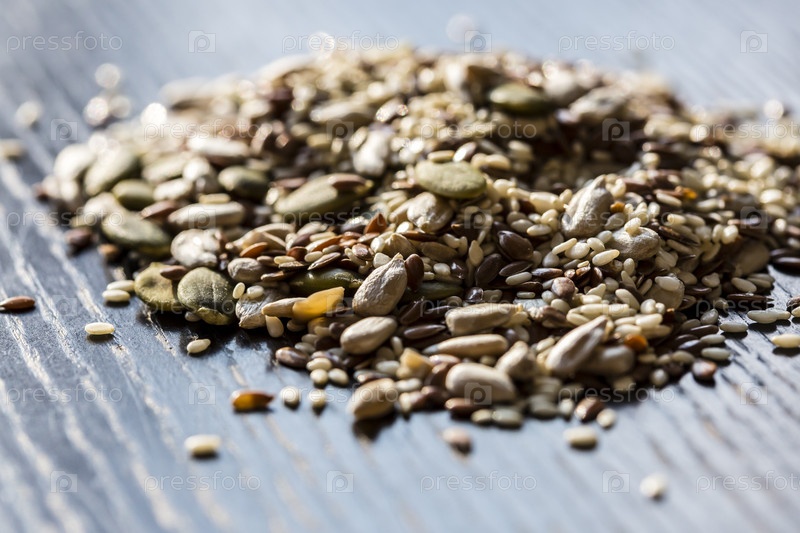 Смешанные сухие семена тыквы, кунжута, подсолнуха, льна для здорового питания на деревянном черном столе