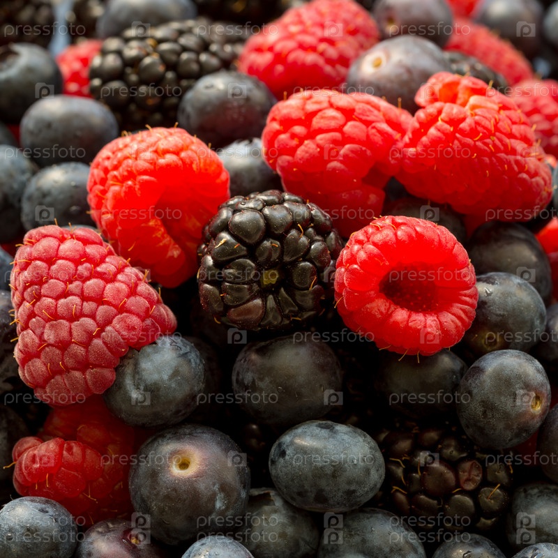 Свежая спелая сочная органическая черника, малина, ежевика, крупным планом