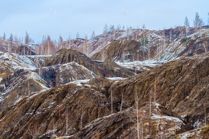 Осенний природный ландшафт. Заброшенные угольные карьеры у деревни Кондуки, Романцевские горы, Россия