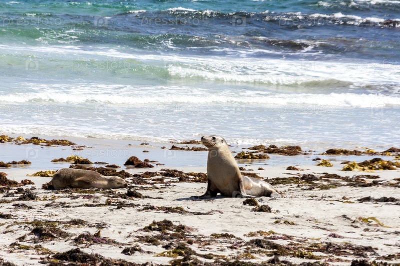 Два австралийских морских льва (Neophoca cinerea) на пляже острова Кенгуру, Южная Австралия, залив Сил