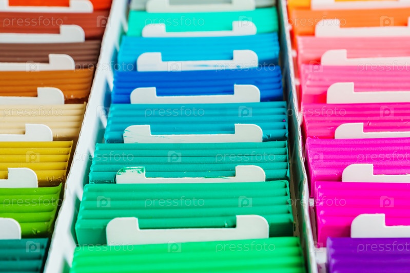 Цвета радуги из пластилина. Разноцветные пластилиновые батончики в коробке, фоновая текстура