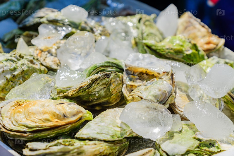 Много свежих закрытых устриц на льду. Закрыть. Рынок морепродуктов