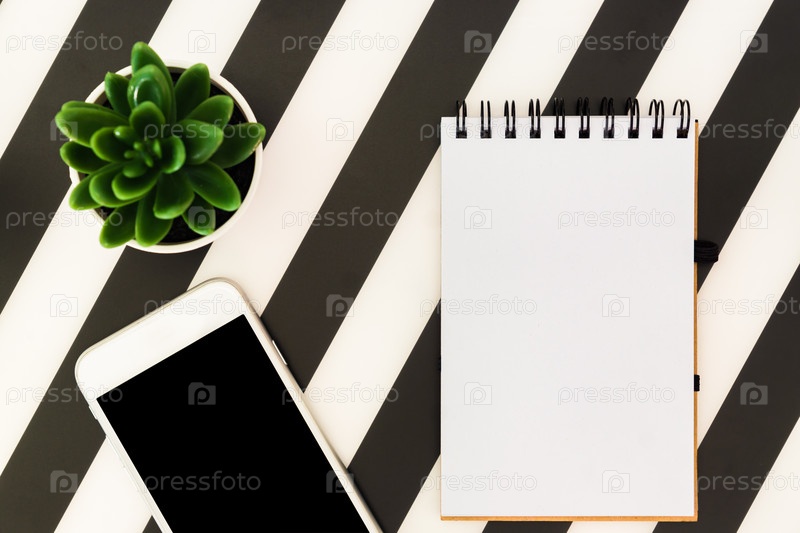 Стильное минималистичное рабочее пространство с ноутбуком, мобильным телефоном и сочными на полосатом черно-белом фоне. Плоский вид сверху
