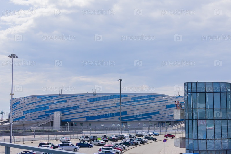 Сочи, Россия - 07 сентября 2019 г.: Олимпийский парк Сочи летом. Вид на Ледовый дворец «Айсберг» и развевающиеся Флаги стран-участниц Олимпийских игр