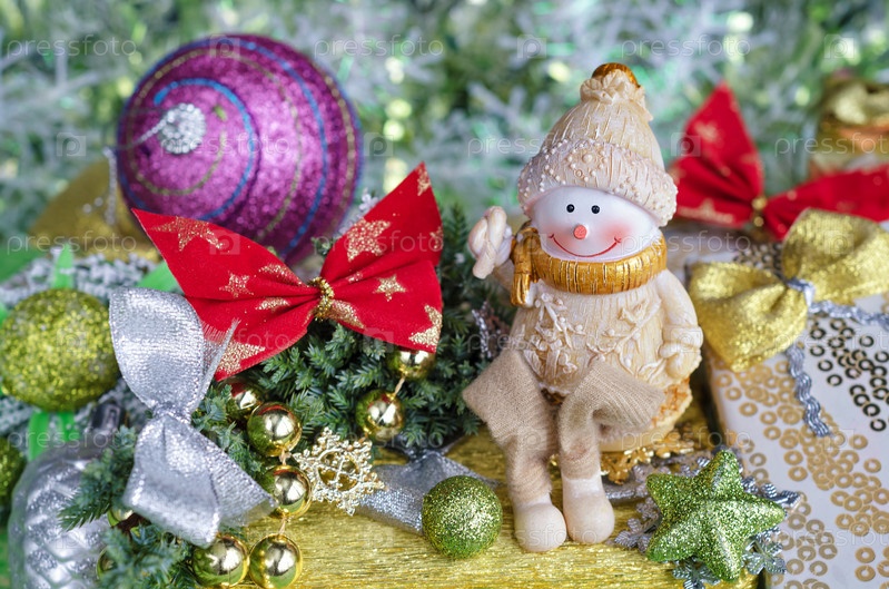 Рождественская аранжировка. Веселый снеговик и елочные украшения