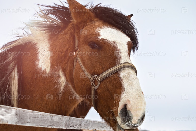 Портрет пятнистой лошади зимой за живой изгородью