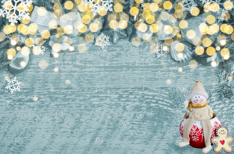 Рождественский тонированный фон с боке. Забавный игрушечный снеговик