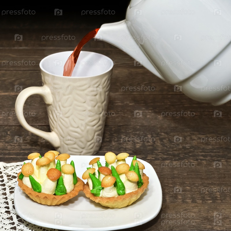 Торты и чай наливают в чашку