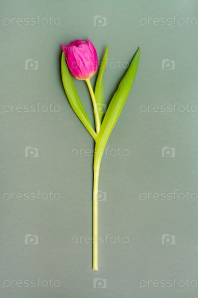 Одинокий розовый тюльпан с зелеными листьями на сплошном темном фоне. Скопируйте пространство. Вертикальный вид