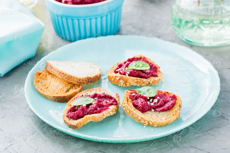 Домашняя брускетта с хумусом из свеклы на маленьком запеченном тосте из багета на тарелке на столе