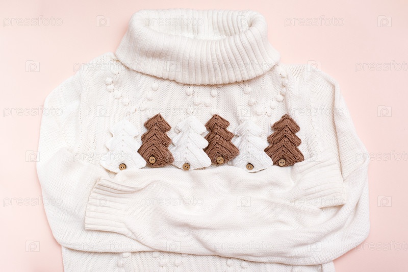 Рождественское настроение. Белый свитер обнимает вязаные елочки. Ремесленный декор. Ноль отходов
