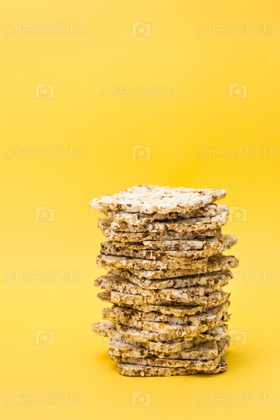 Здоровое питание. Хрустящее тесто из семян овса, пшеницы, льна и кунжута в стопке на желтом фоне. Суперфуд. Вертикальный вид