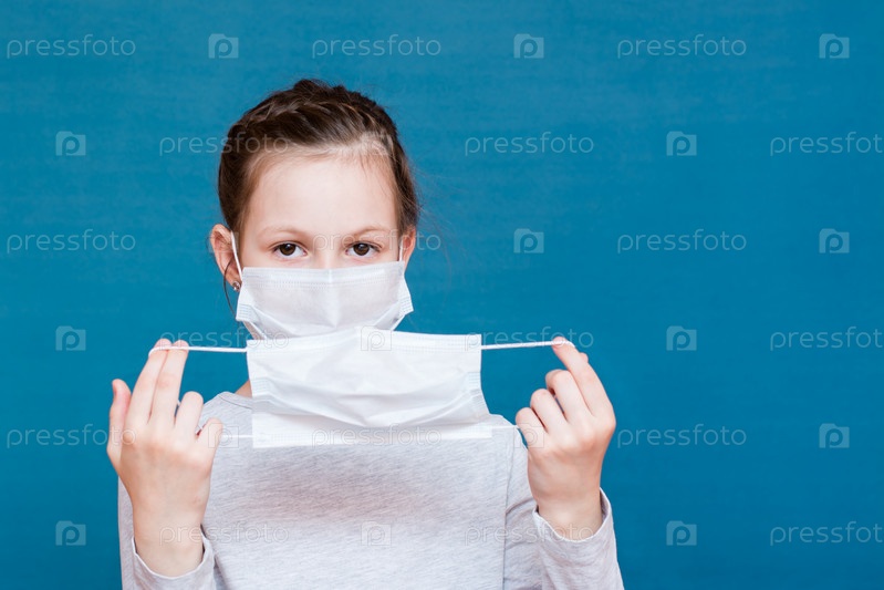 Девушка в медицинской маске надевает на себя вторую чистую маску. Защита детей