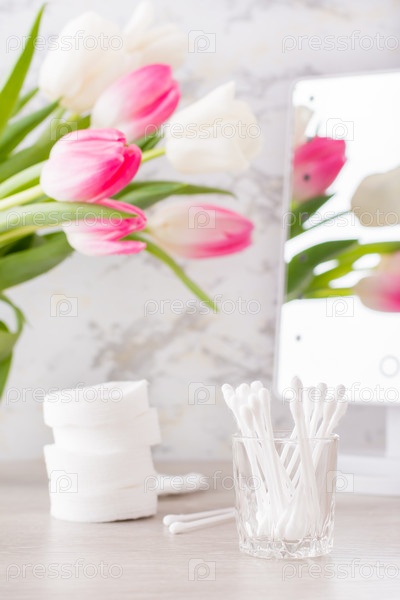 Личная гигиена, чистота и уход за кожей. Ватные диски и тампоны на столе перед зеркалом. Вертикальный вид
