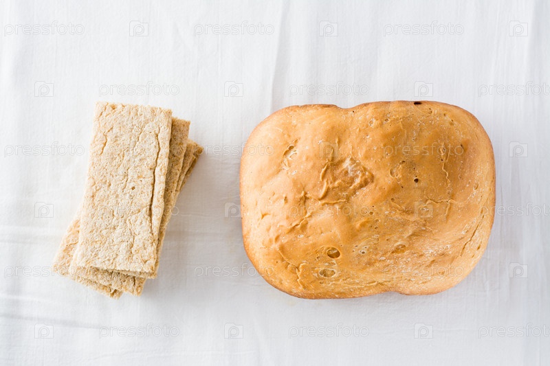 Концепция выбора между свежей буханкой пшеничного домашнего хлеба и хлебцами из хлопьев на белой ткани. Вид сверху