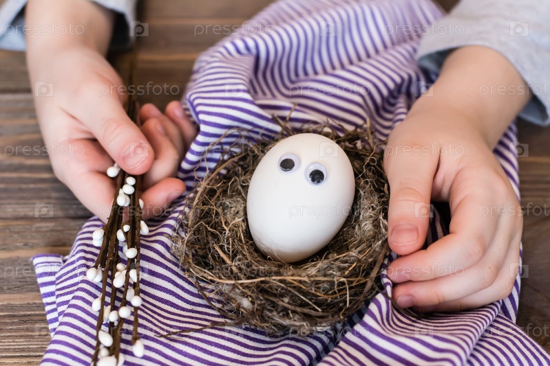 Счастливой Пасхи. Неокрашенное яйцо с глазами в птичьем гнезде, детские руки и ветки ивы на деревянном столе. Концепция отказа от красителей в пищевых продуктах. Безопасность для детей