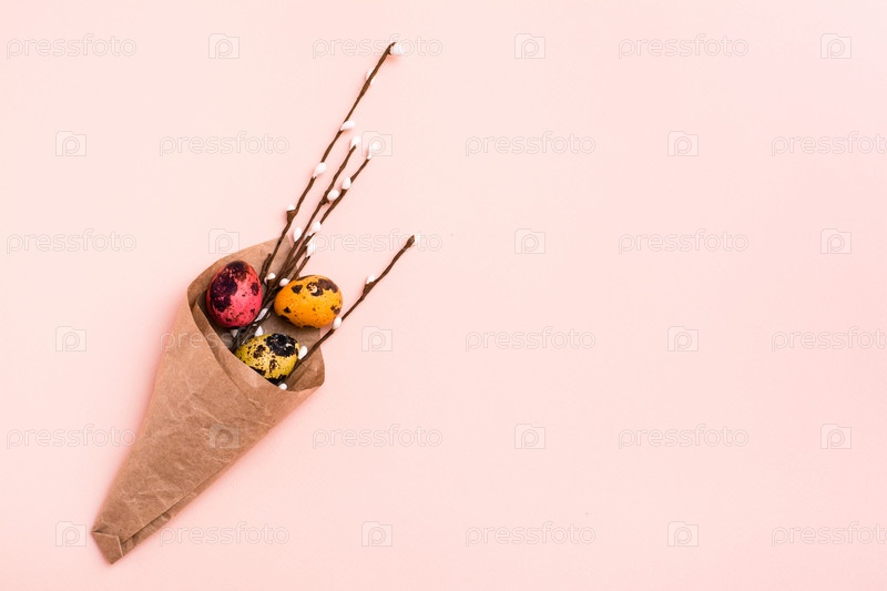 Счастливой Пасхи. Букет из расписных перепелиных яиц и веток вербы, завернутые в коричневую бумагу на розовом фоне