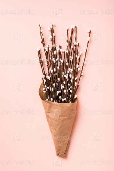 Счастливой Пасхи. Упаковка с букетом вербы на розовом фоне. Вертикальный вид