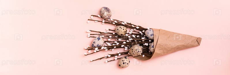 Счастливой Пасхи. Букет из перепелиных яиц и ветвей вербы, завернутый в коричневую бумагу на розовом фоне. Веб-баннер