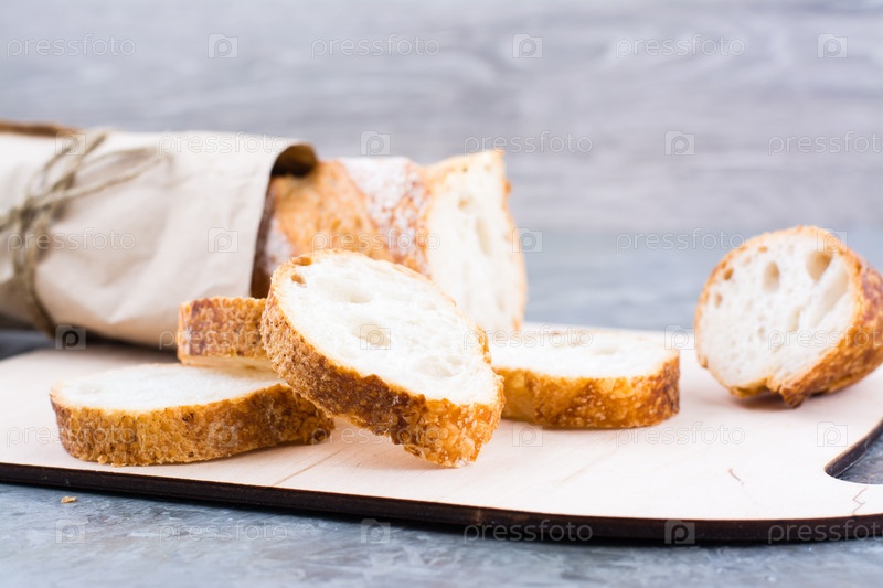 Свежий багет в оберточной бумаге разрезать на куски на разделочной доске на столе. Крупный план