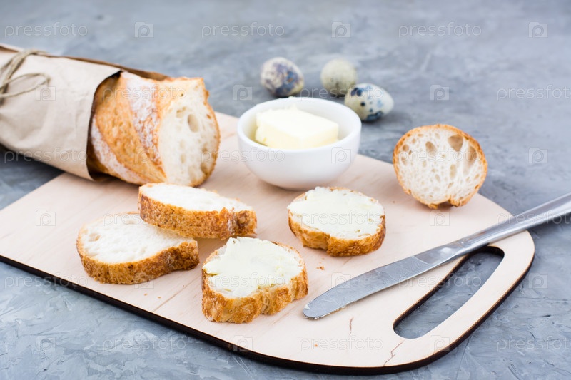 Вкусный завтрак. Бутерброды со свежим багетом с маслом и перепелиными яйцами на разделочной доске на столе