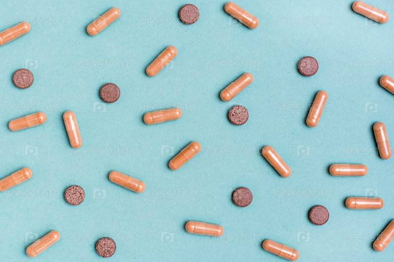 Абстрактный зеленый фон с травяными капсулами и таблетками. Нетрадиционная медицина. Вид сверху