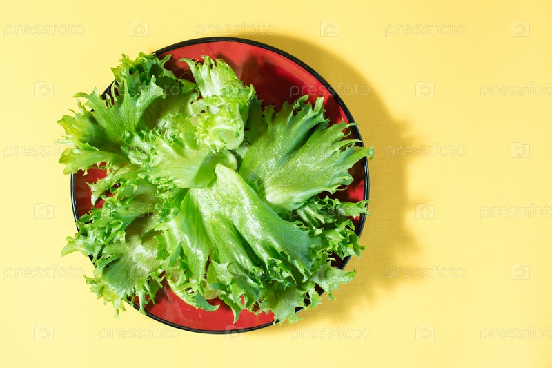 Свежие листья салата фризе на тарелке на желтом фоне. Здоровое питание и вегетарианство. Жесткий свет. Вид сверху. Копировать пространство