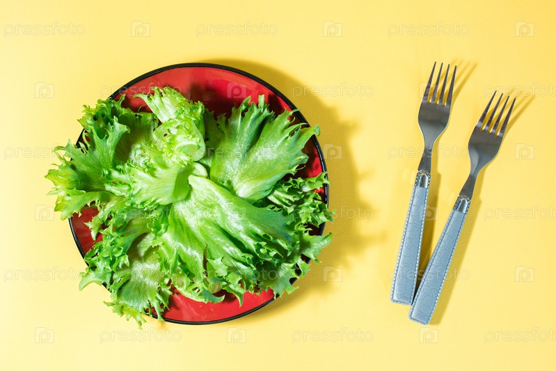 Свежие листья салата фризе на тарелке и вилки на желтом фоне. Здоровое питание и вегетарианство. Жесткий свет. Вид сверху