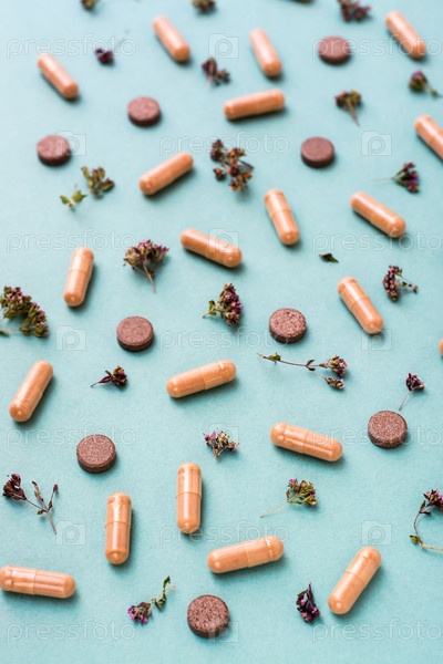 Абстрактный зеленый фон с капсулами, таблетками и травами. Нетрадиционная медицина. Вертикальный вид