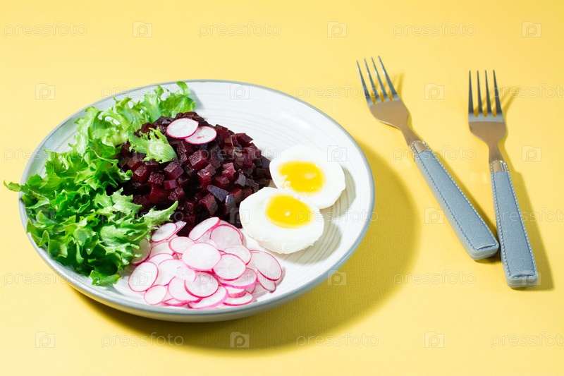 Диетическое блюдо из овощей. Тартар из свеклы, редис, фризовый салат и вареное яйцо на тарелке и вилка на желтом фоне. Жесткий свет