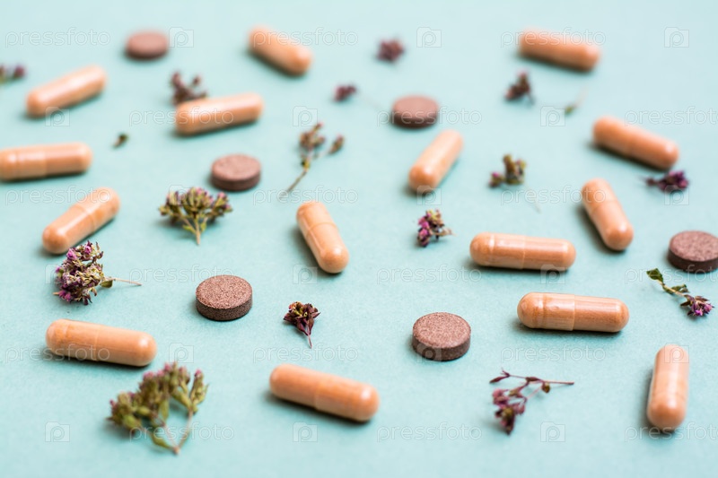 Абстрактный зеленый фон с капсулами, таблетками и травами. Нетрадиционная медицина. Выборочный фокус